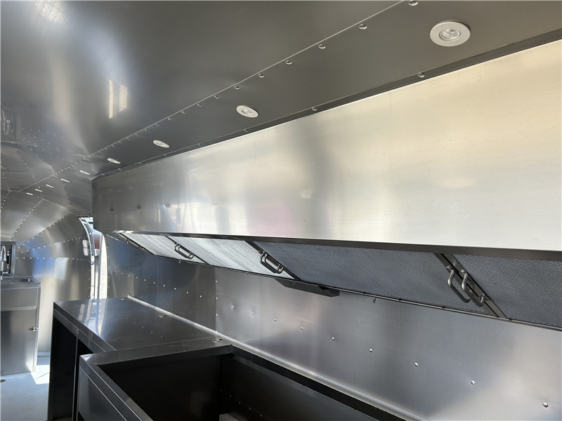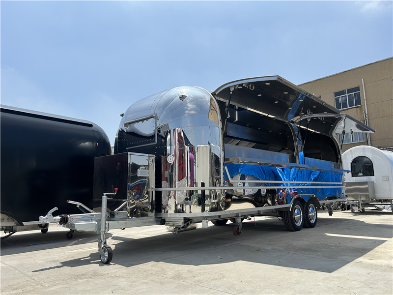 Standard Description: 1.Exterior material: stainless steel. 2.Interior material: white color fiberglass. 3.Outside configuration: tow bar with coupling, power inlet connector, service window, tires, entrance door,step board, anti-collision beam, tail lights system. 4.Inside configuration: led panel lights, electric system, anti-slip floor, breaker. 5.Customized size: length from 330cm to 1000cm. 6.Stainless steel type options: 1) Mirror stainless steel; 2) Brushed stainless steel. (free of charge) 7.Inside need customize, default inside no working bench, no sinks, no range hood, no any cooking equipment.